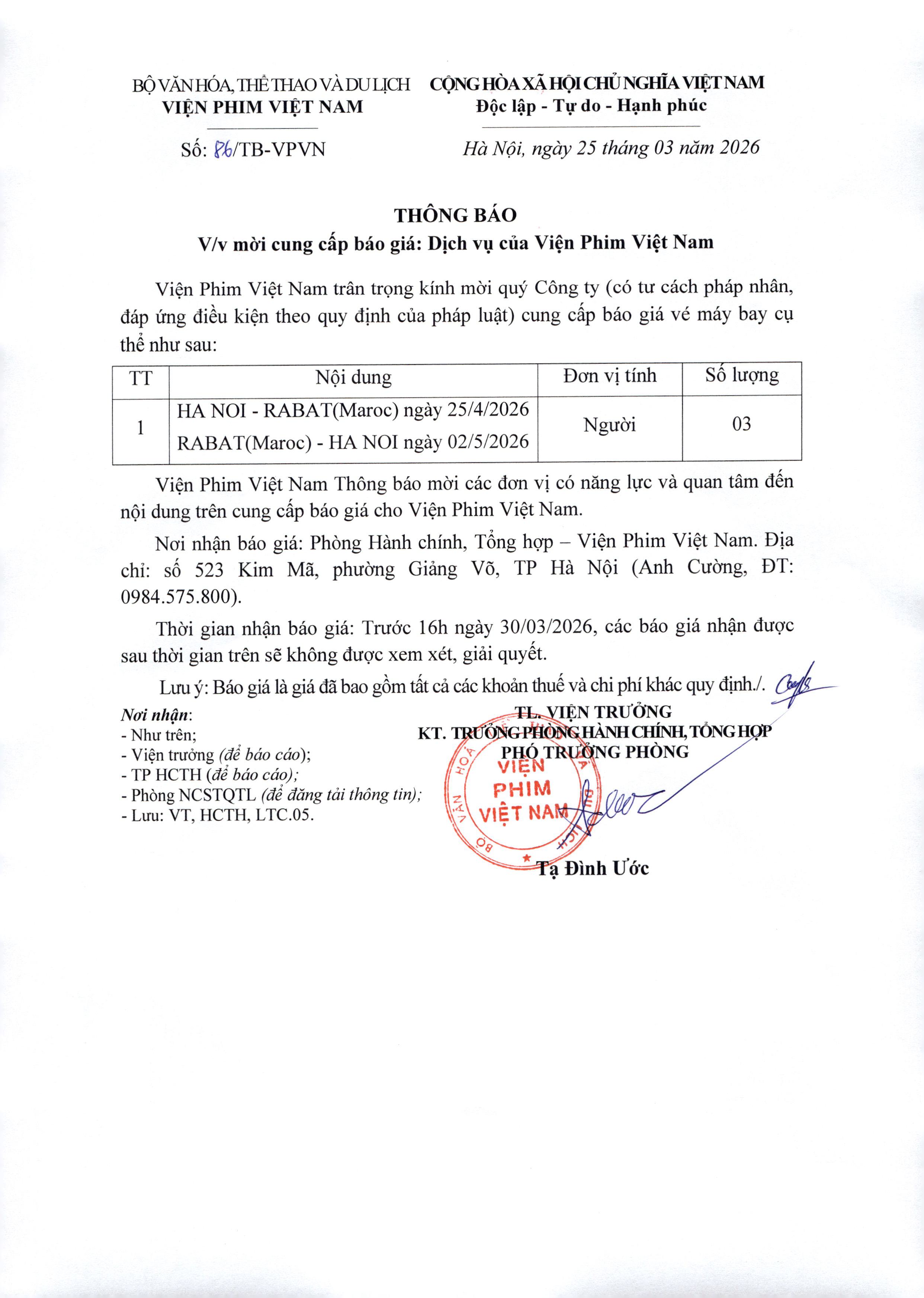 Thông báo mời cung cấp báo giá dịch vụ của Viện Phim Việt Nam