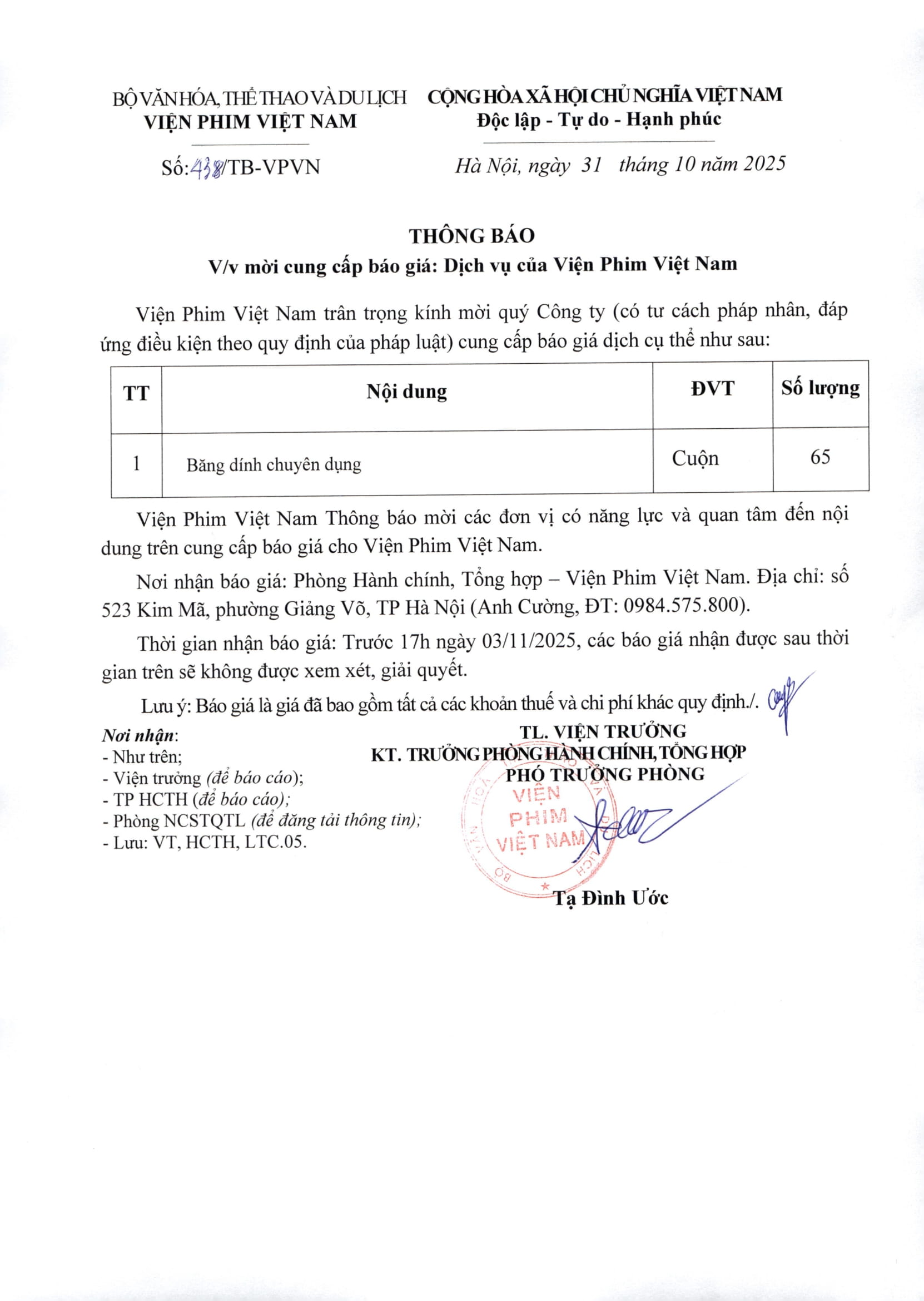 Thông báo mời cung cấp báo giá: Dịch vụ của Viện Phim Việt Nam