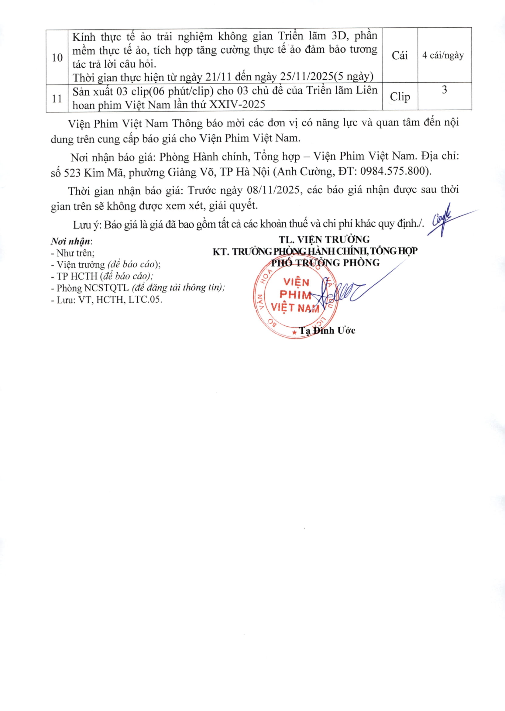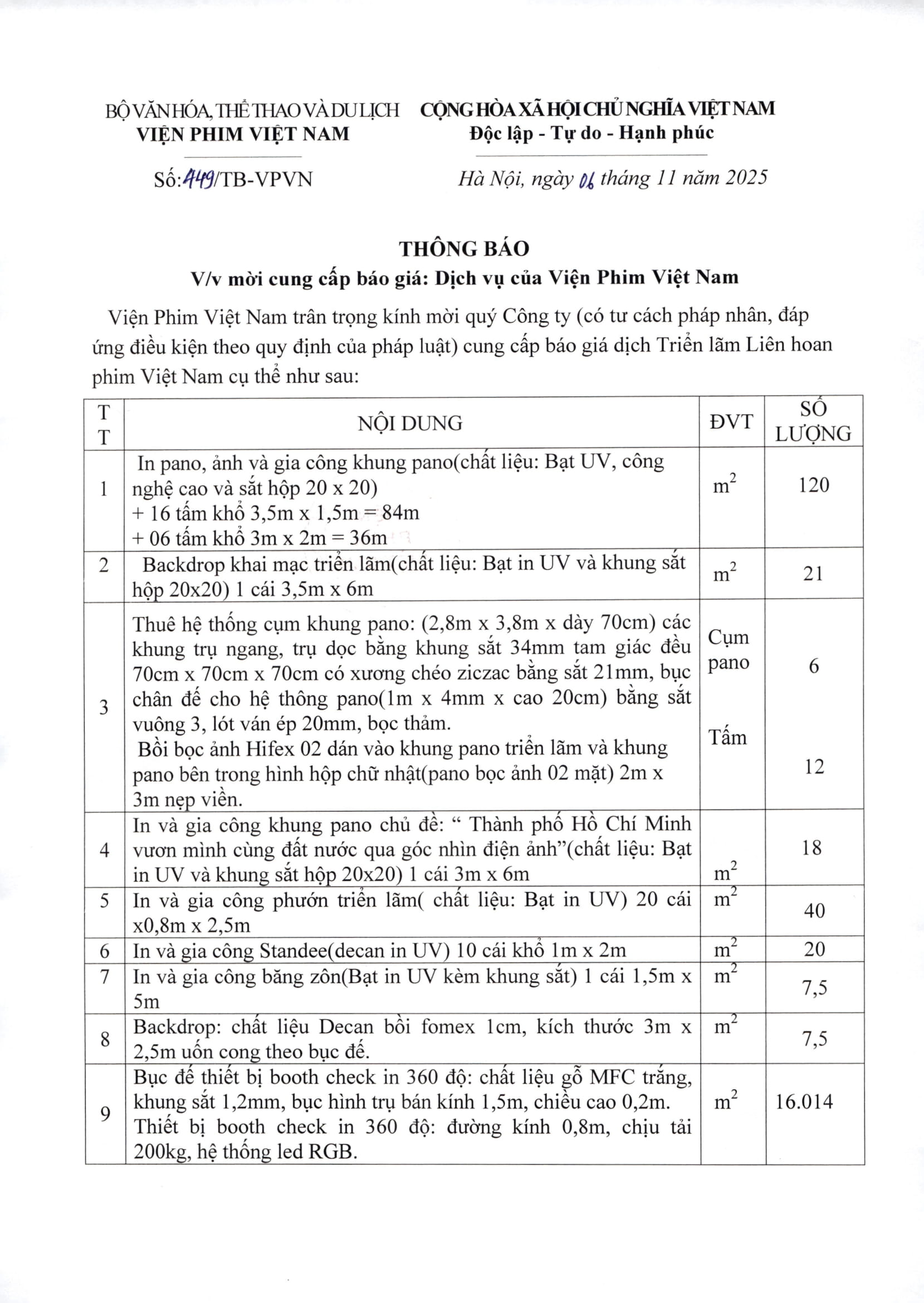Thông báo mời cung cấp báo giá: Dịch vụ của Viện Phim Việt Nam