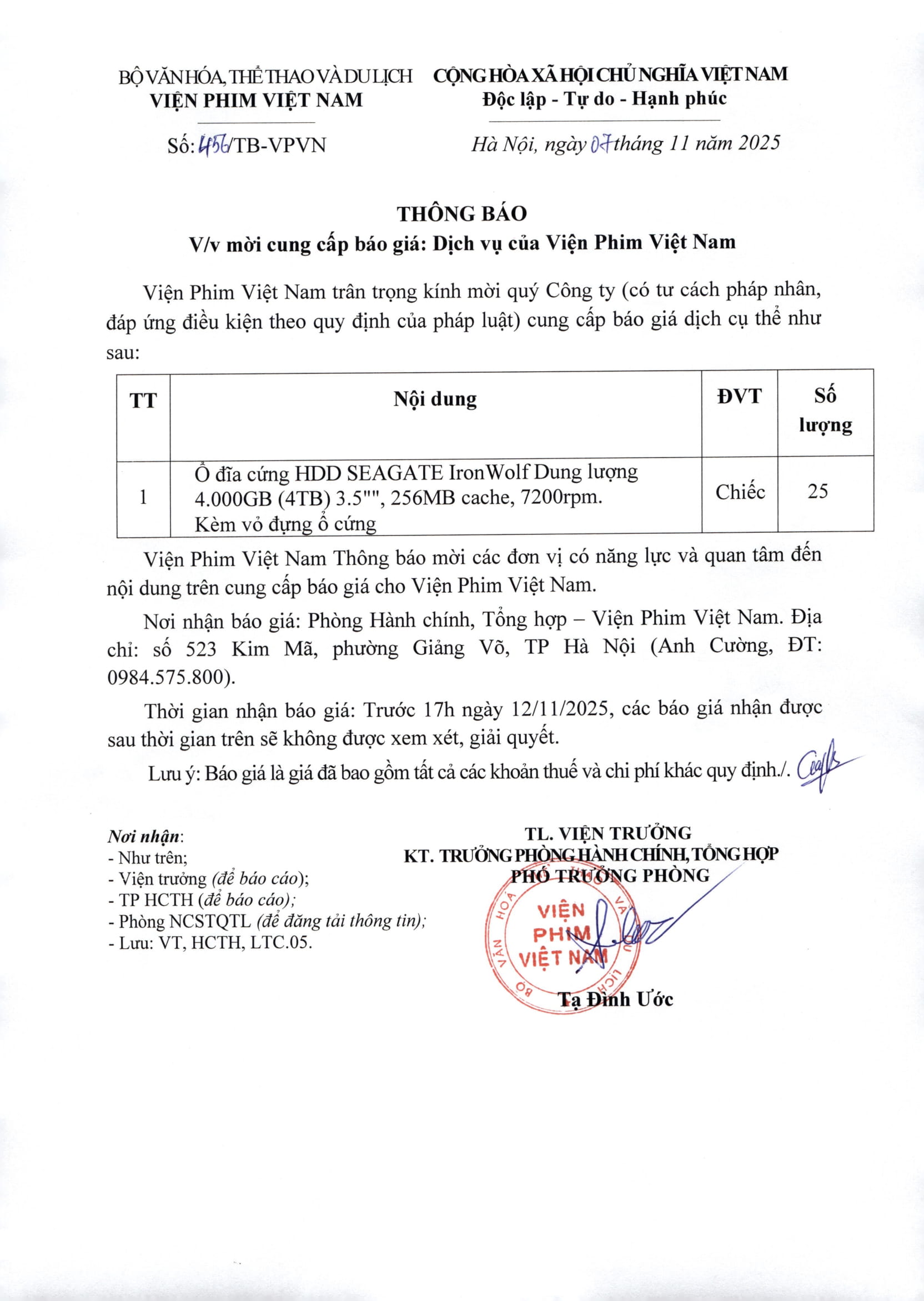 Thông báo mời cung cấp báo giá: Dịch vụ của Viện Phim Việt Nam