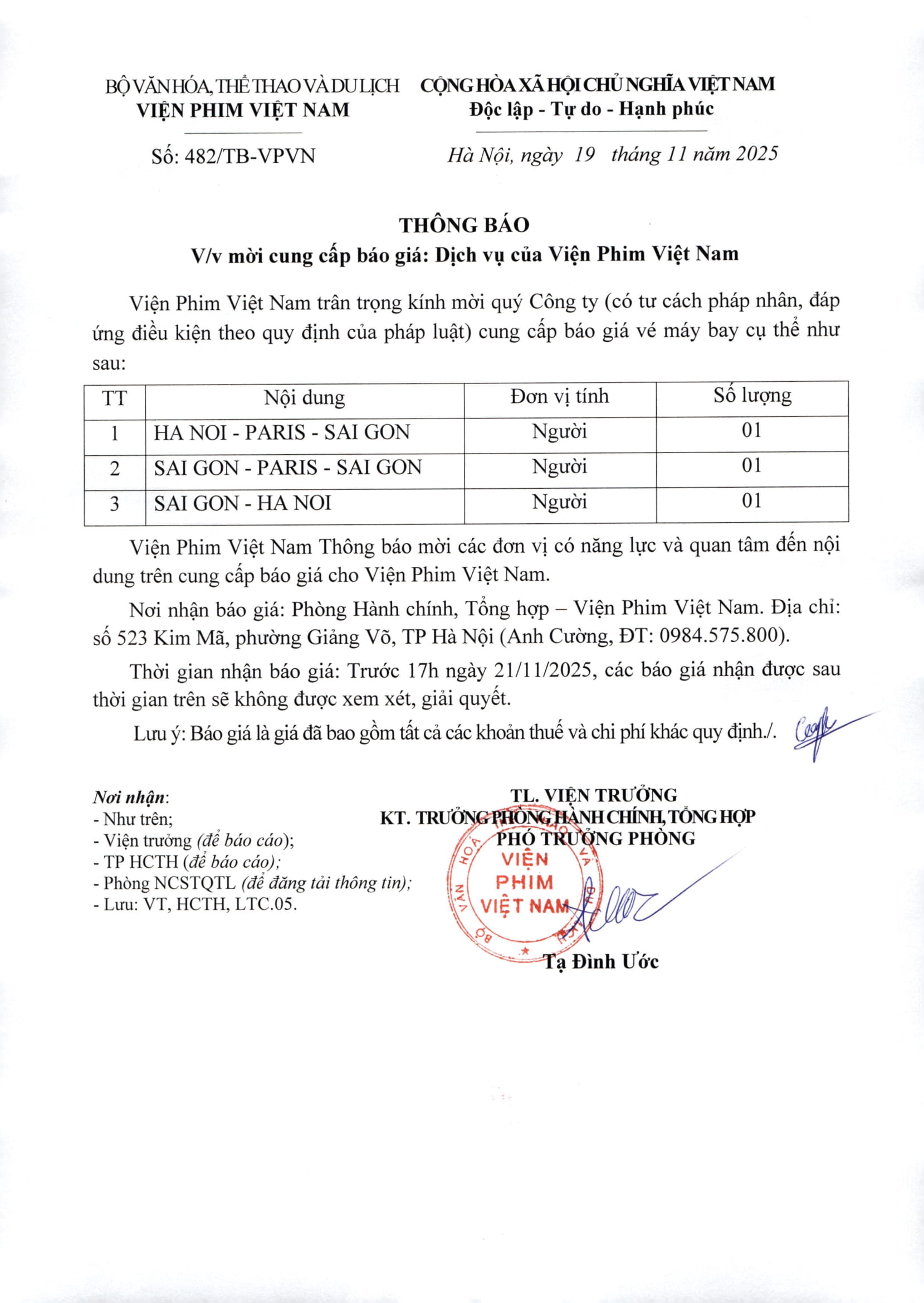Thông báo mời cung cấp báo giá: Dịch vụ của Viện Phim Việt Nam