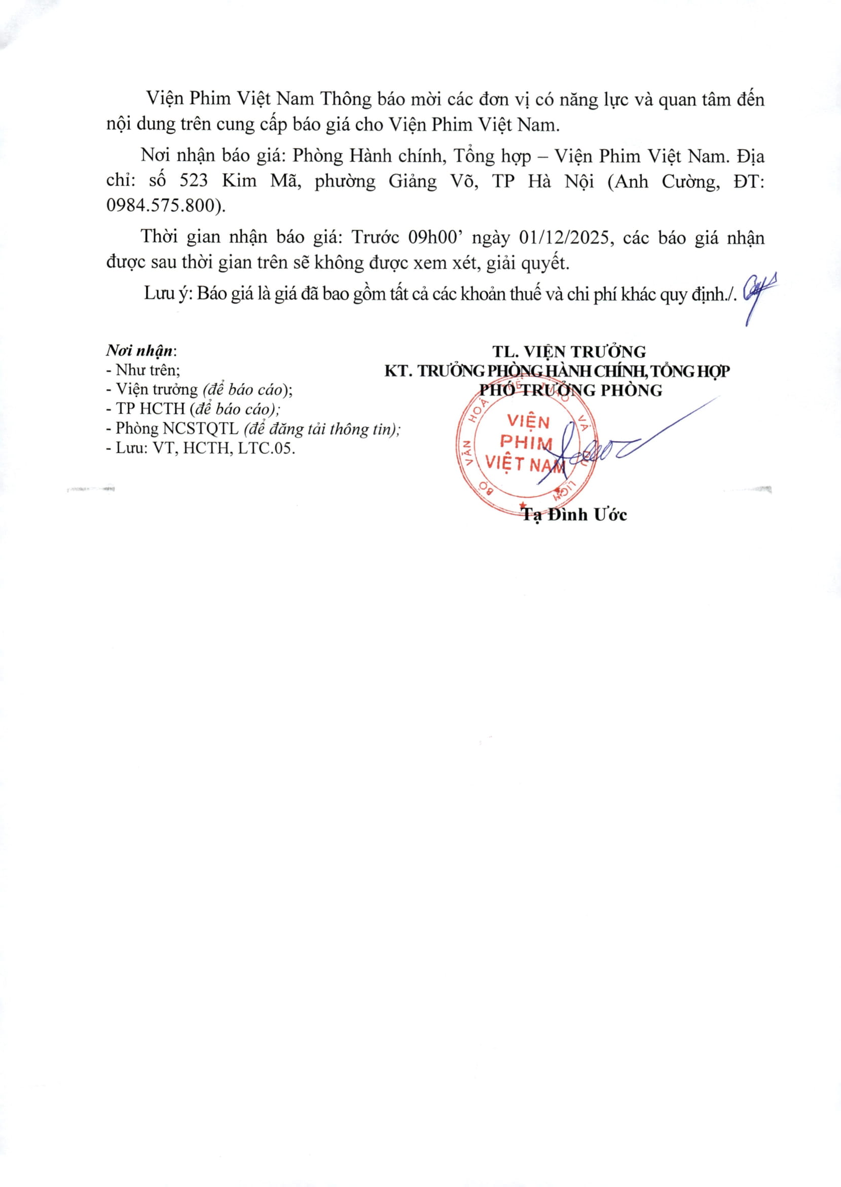 Thông báo mời cung cấp báo giá: Dịch vụ của Viện Phim Việt Nam