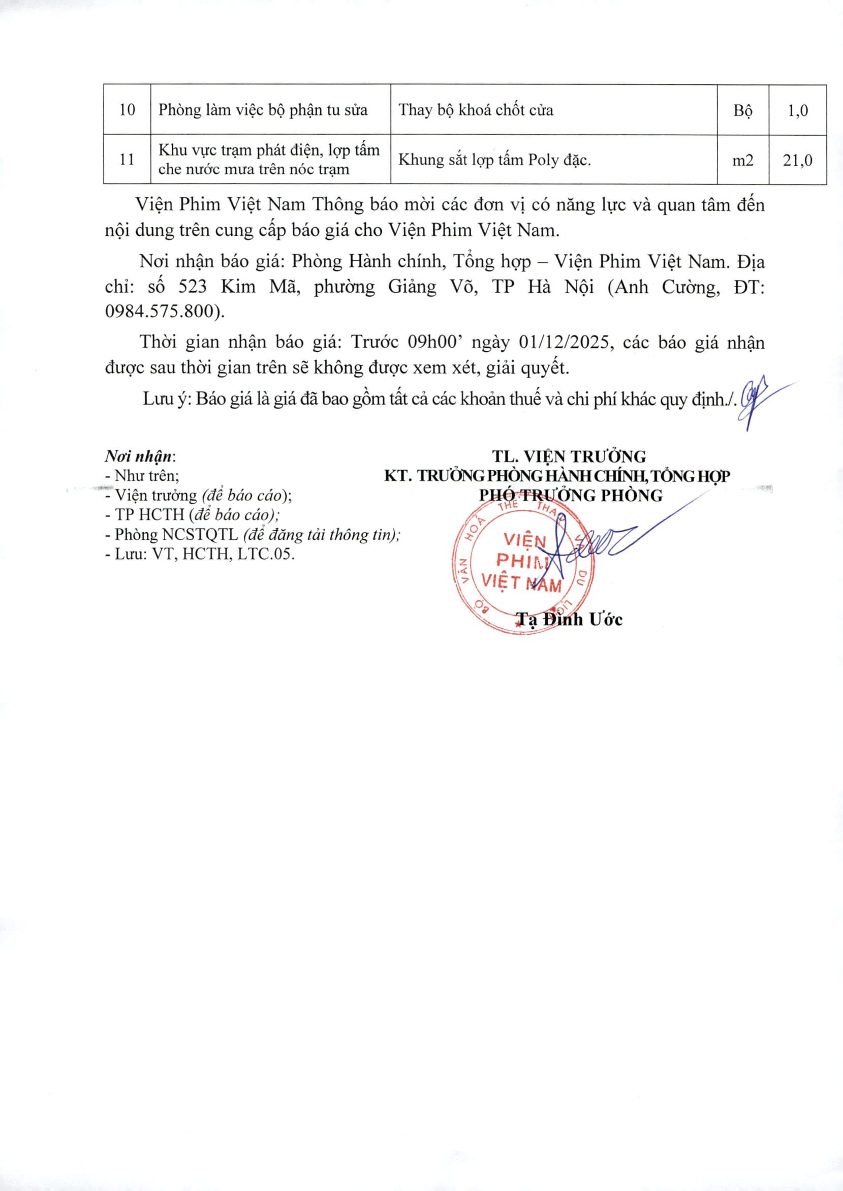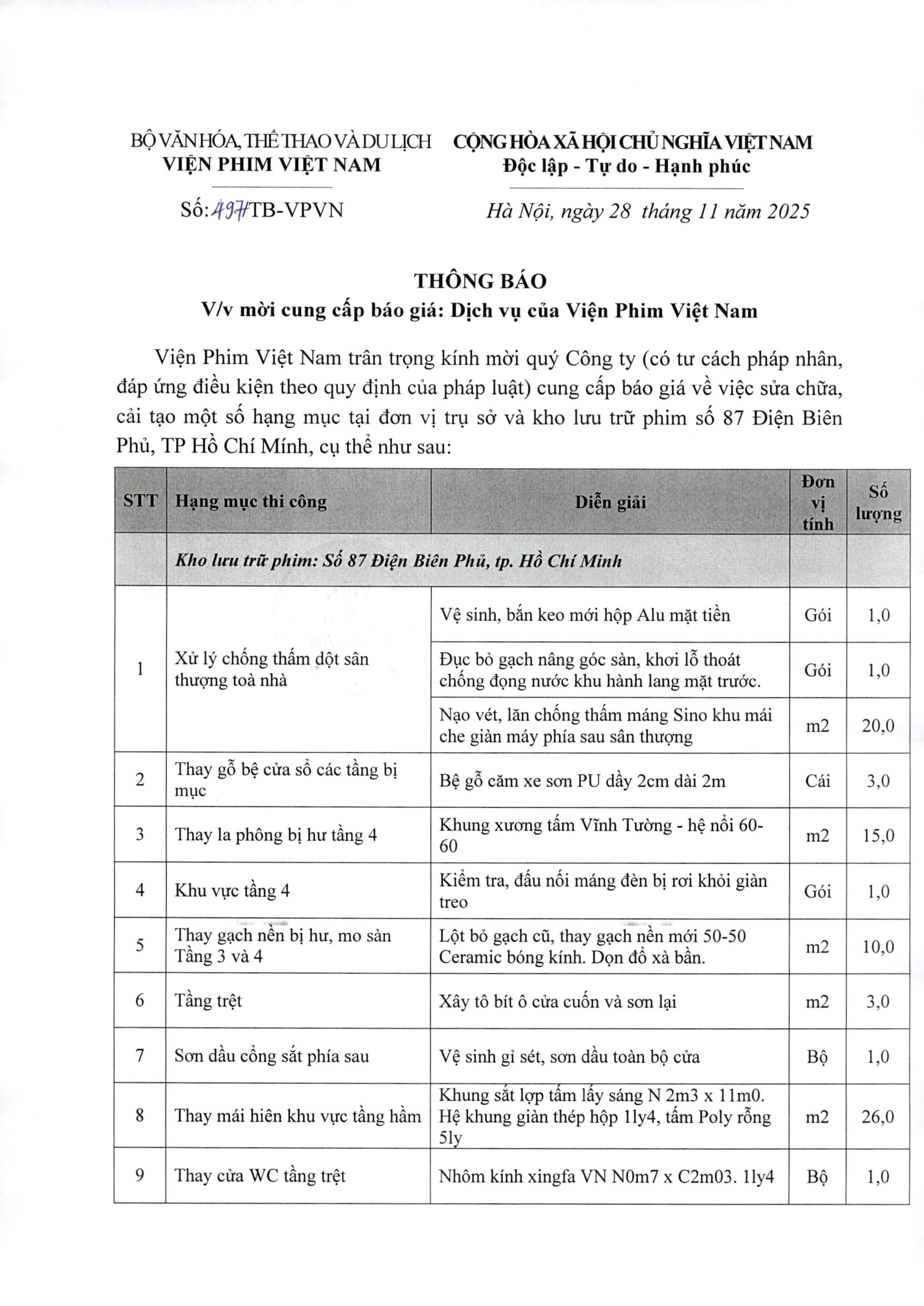 Thông báo mời cung cấp báo giá dịch vụ của Viện Phim Việt Nam