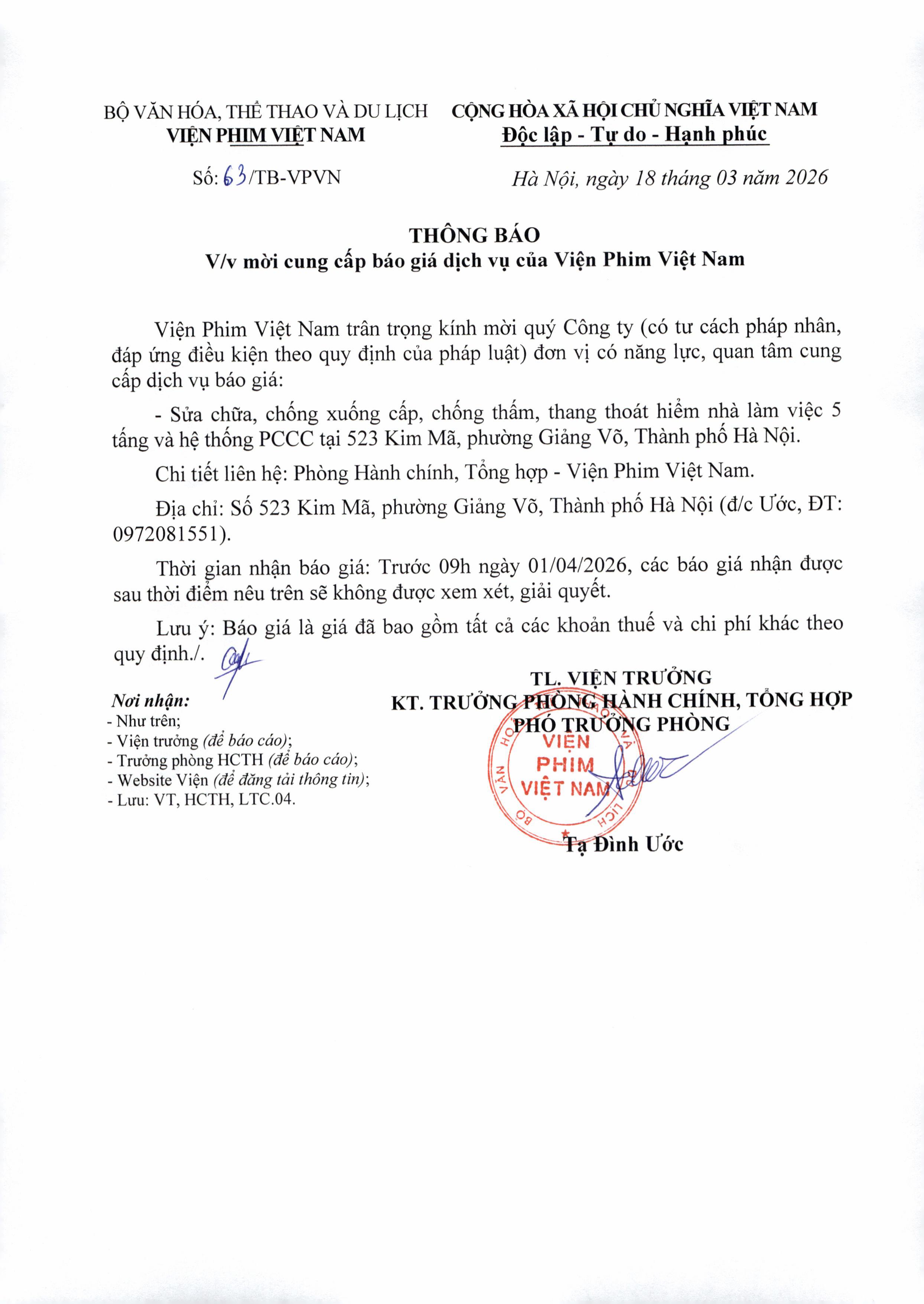 Thông báo mời cung cấp báo giá dịch vụ của Viện Phim Việt Nam