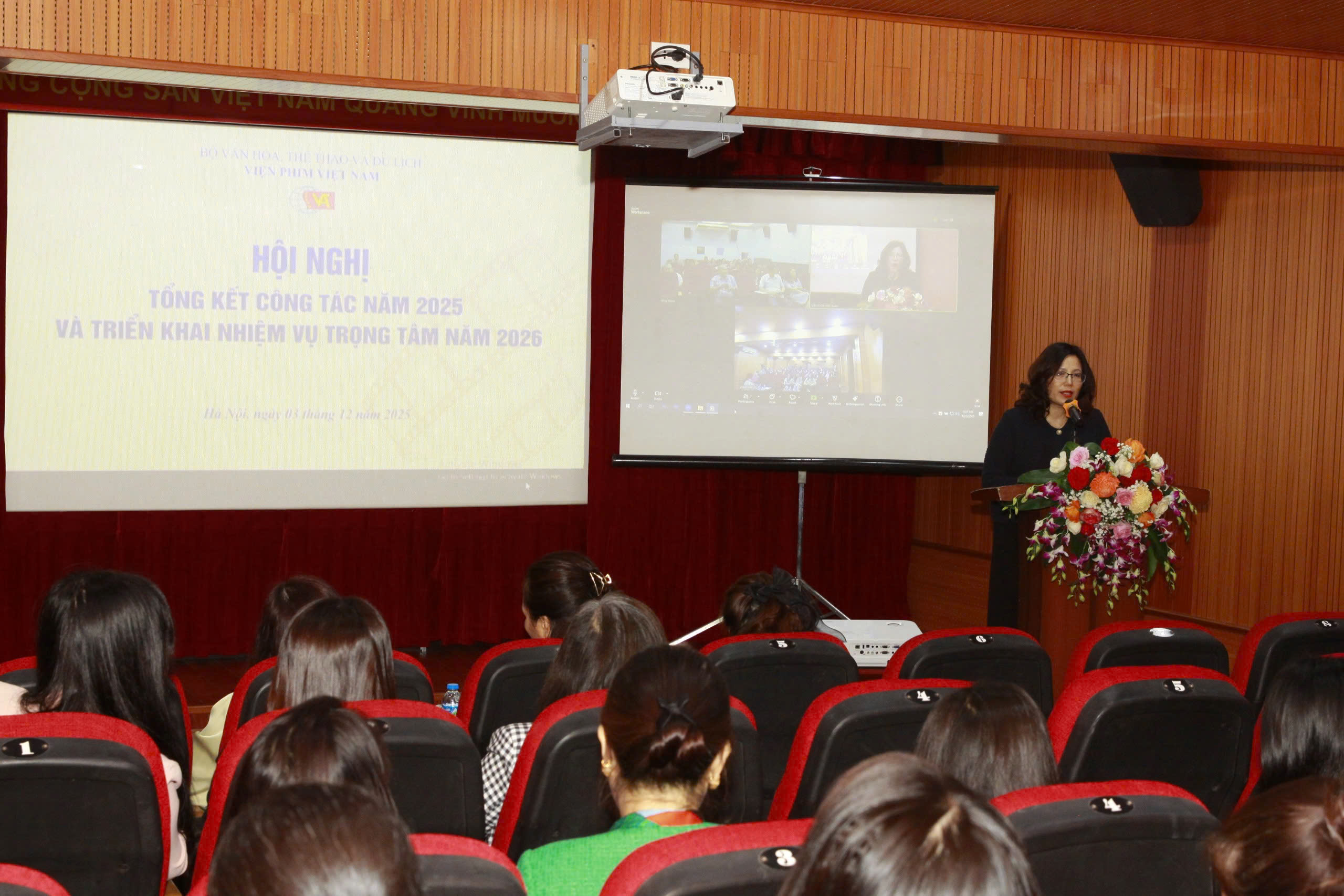 Hội nghị lắng nghe Báo cáo Tổng kết công tác năm 2025 và Phương hướng nhiệm vụ năm 2026 do bà Ngô Đặng Trà My trình bày. Báo cáo nhấn mạnh: Năm 2025, Viện Phim Việt Nam đã hoàn thành đúng tiến độ, đảm bảo chất lượng 03 nhiệm vụ cam kết với Bộ trưởng, đồng thời chủ động triển khai các nhiệm vụ thường xuyên và đột xuất, được Lãnh đạo Bộ đánh giá cao. Báo cáo đưa ra phương hướng, nhiệm vụ trọng tâm của Viện năm 2026 với đa dạng nội dung công việc, bao gồm cả nhiệm vụ chính trị và triển khai thực hiện công việc chuyên môn thuộc chức năng của Viện.